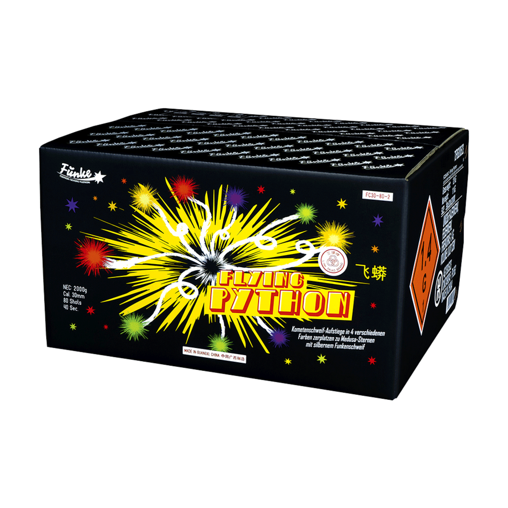 80 Schuss Verbund im Kaliber 30mm . Kometenschweif-Aufstiege in 4 verschiedenen Farben zerplatzen zu Medusa-Sternen mit silbernem Funkenschweif.