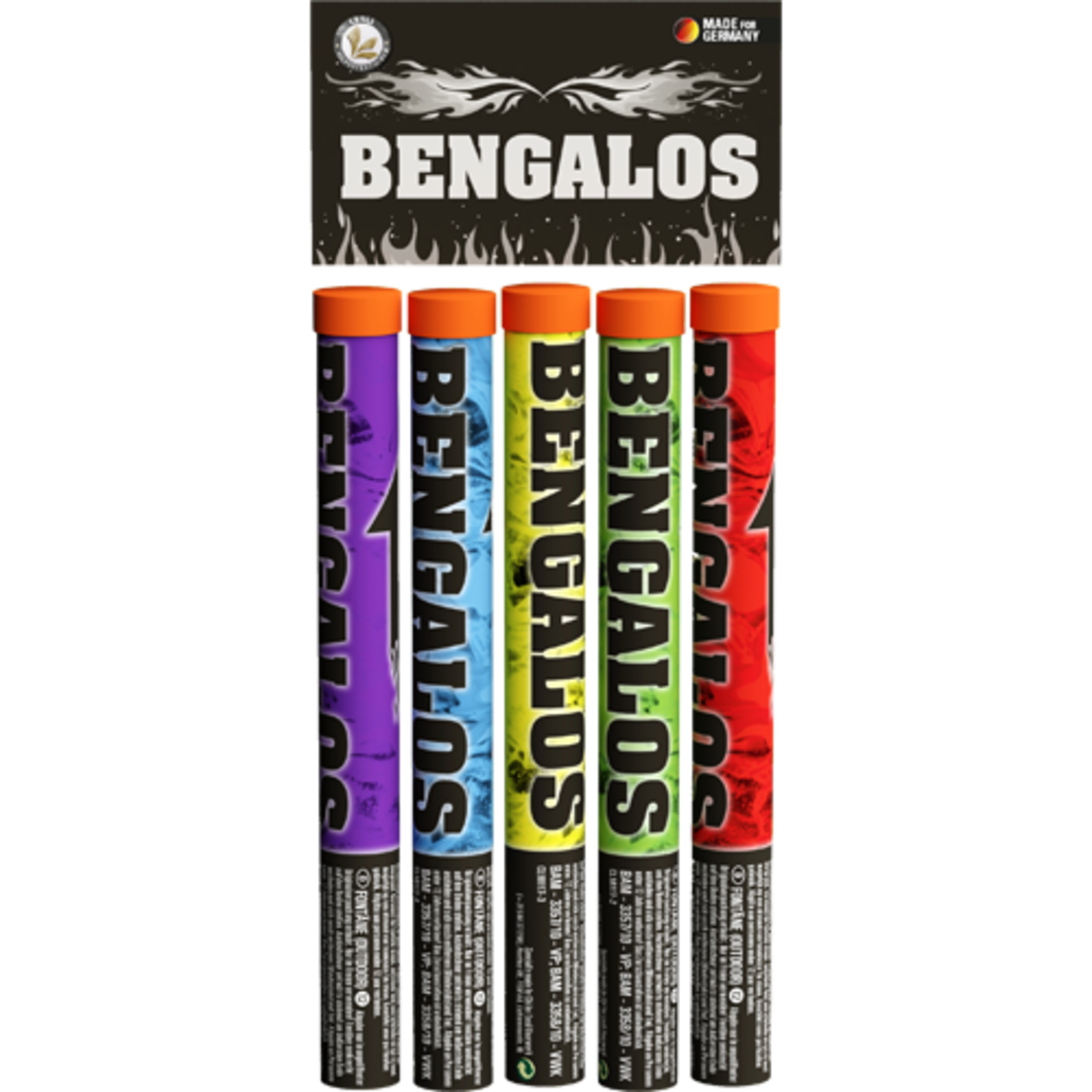 Bengal-Fackel für das ganze Jahr in rot, grün, gelb, blau und lila.